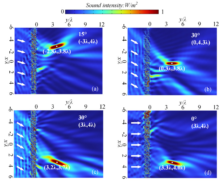 论文设计了一种基于双开口谐振环的可调声学无源相控阵,它可以通过控制旋转角度对声波进行调制,弥补了普通超材料固定结构后无法更改的缺陷。旋转角度根据广义斯奈尔定律进行选择,不仅能在较大频率范围内实现聚焦功能,还能满足不同角度入射声波的聚焦需求,以及控制焦点的位置。