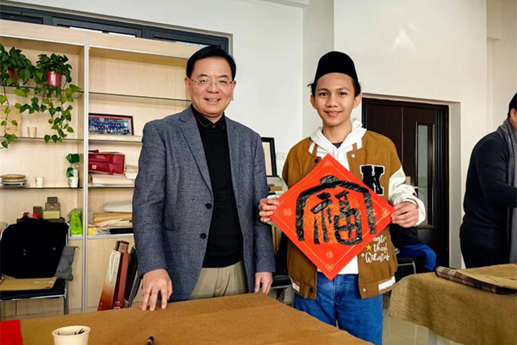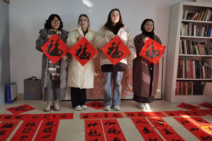 活动现场,书法家们泼墨挥毫,送上散发着浓浓墨香的大红春联喜庆热烈,吉祥的“福”字熠熠生辉,让前来参加活动的师生感受到新春将至的浓浓年味,也让在场的海外留学生感受到了中国悠久的传统文化和学校深厚的文化底蕴。