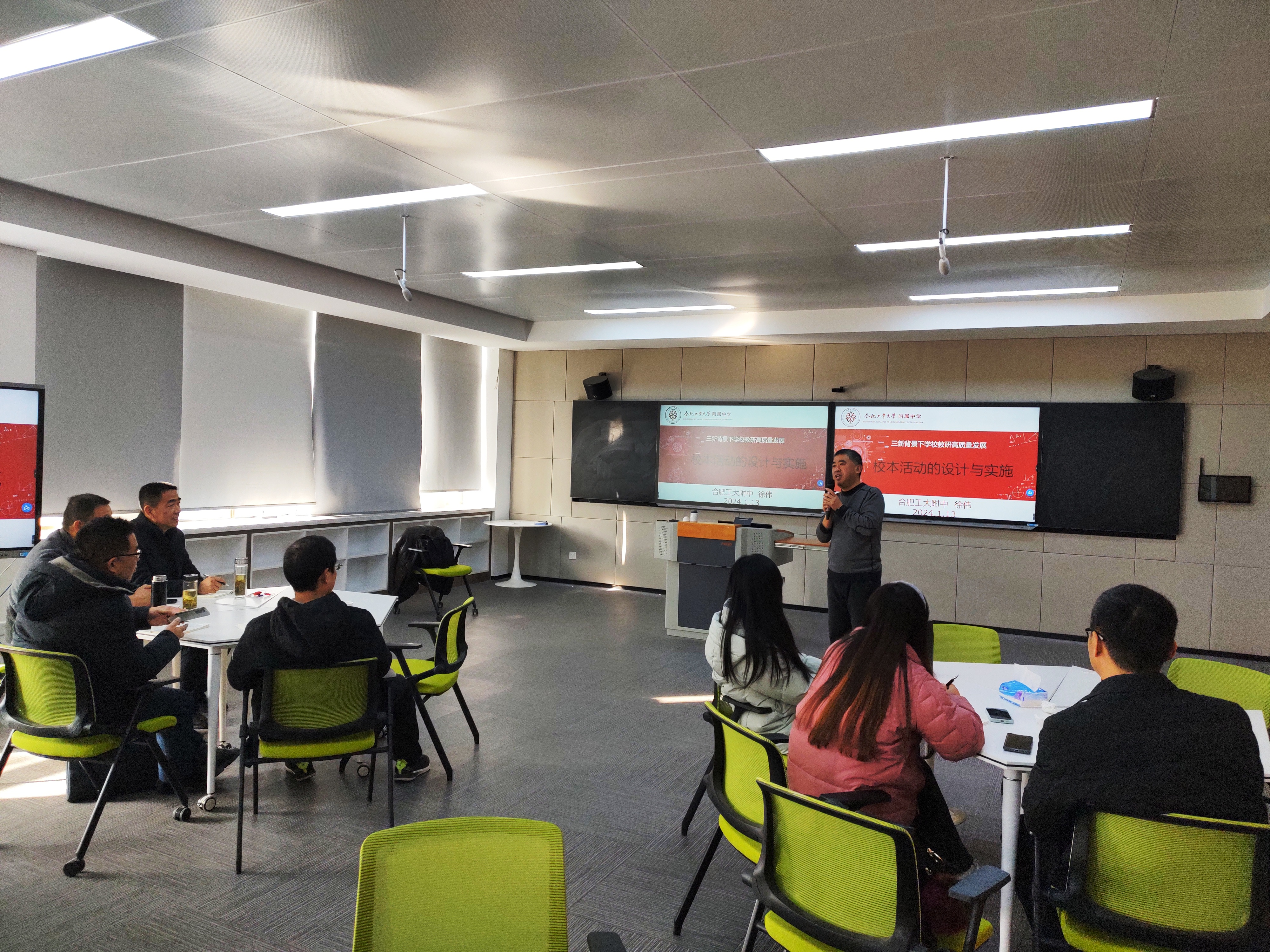 本次活动由学校教务处、教师发展中心联合组织,严桥中学副校长周建红率相关科室负责人、教研组长共13人参加。周建红一行参观了学校教师教学发展培训中心等场所,与教务处、教师发展中心负责人深入交流。合肥市学科带头人徐伟应学校邀请,以“学校校本教研活动的设计与实施”为主题,为全体参训教师举行了讲座,对教师教研能力提升、职业生涯发展规划和学校教研高质量发展路径等方面进行深入阐释,分享了校本教研活动建设心得,并与大家进行热烈研讨。