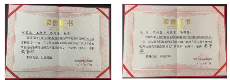 会议宣布了安徽省高校采购理论研究实践创新征文活动评选结果,学校送选的《高校科研仪器设备政府采购需求管理的若干思考和建议》和《高校政府采购市场开放对营商环境的挑战研究》在征文活动中分别荣获二等奖和三等奖。