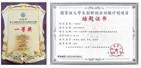 国家级大创项目质量显著提升。2022年度顺利结项38项国家级大创(结项率52.78%)、2023年度立项74项国家级大创。成果转化为二类以上学科竞赛获奖率提升27.3%,2位本科生以第一作者在SCI期刊上发表项目论文,国家级大创项目成果《受撞“可熔断”的新型桥墩护筒装置研发》,成为学校首个入选全国大学生创新年会的作品。