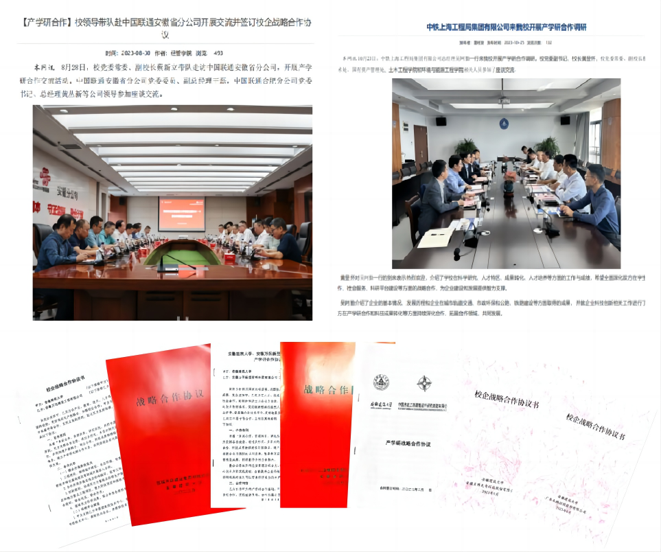 校地、校企政产学研合作不断深化。2023年,学校与中国二十二冶集团有限公司等知名企业签订战略合作协议15项;先后赴黄山、蚌埠、宿州等地,在城市体检、生态城区建设、装配式建筑等领域推动项目落地实施,为地方经济社会发展提供新动力。产学研项目和经费体量稳步提升。2023年学校签订产学研项目249项,合同总金额10147.14万元,到账经费5278.44万元;2023年学校在安徽省技术合同认定登记系统完成合同登记130项,合同金额约4003.29万元,其中技术额约3937.29万元。