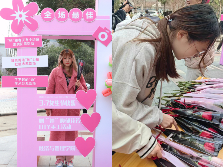 活动现场,“送她一朵小红花”“手绘自画像”“拍照打卡”三项活动吸引众多女生踊跃参与,现场热闹非凡。