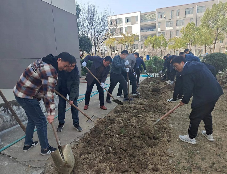 12日下午,在学校徽华楼东侧,后勤管理处各党支部与合肥经济技术开发区锦绣社区管理委员会机关党支部约50余人开展“‘植’此新绿 为绿充‘植’”志愿植树活动,挖坑、扶苗、栽树、培土、踩实、浇水……大家齐心协力,共同为春日的校园增添新的绿意。