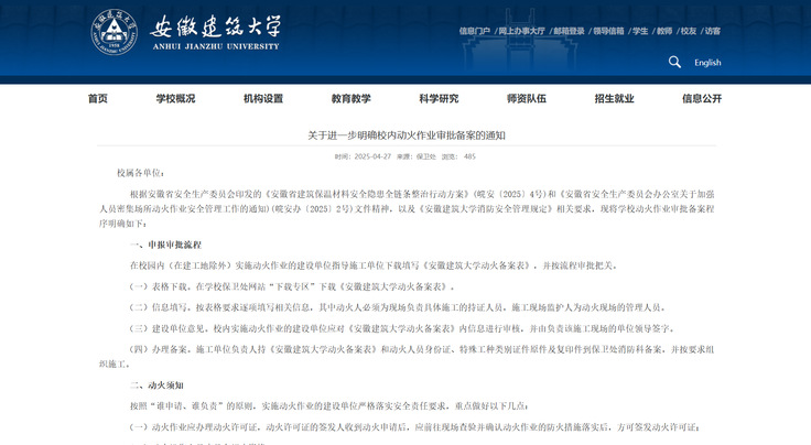 本网讯 为贯彻落实《安徽省建筑保温材料安全隐患全链条整治行动方案》(皖安〔2025〕4号)和《安徽省安全生产委员会办公室关于加强人员密集场所动火作业安全管理工作的通知》(皖安办〔2025〕2号)《关于人员密集场所加强动火作业安全管理的通告》(消防〔2025〕20号)文件精神,并结合《ku游官方消防安全管理规定》相关规定,学校通过“审批备案+现场公示”双举措,构建校园动火作业安全管理体系,切实防范消防安全风险。