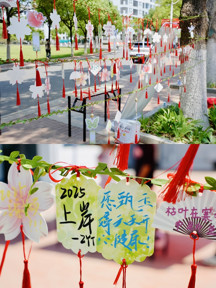 “风铃祈福”活动区则充满了温馨与感动。同学们在空白纸签上写下对自己的鼓励、对朋友的祝福,或是对未来的憧憬。一张张承载着真挚情感的纸签被系在彩绳上,随风轻轻摇曳。纸签摇曳时触发风铃清音与光影涟漪,将静态文字升华为多感官疗愈体验。参加的同学中,有的写下“愿每一天都充满阳光”,有的则表达了对家人和朋友的感谢,万千私语在风中交织成集体诗篇。许多人在风铃前驻足合影,记录下这充满意义的时刻。活动尾声,所有祈福卡将被存放于心理辅导站中,成为我们的专属记忆。