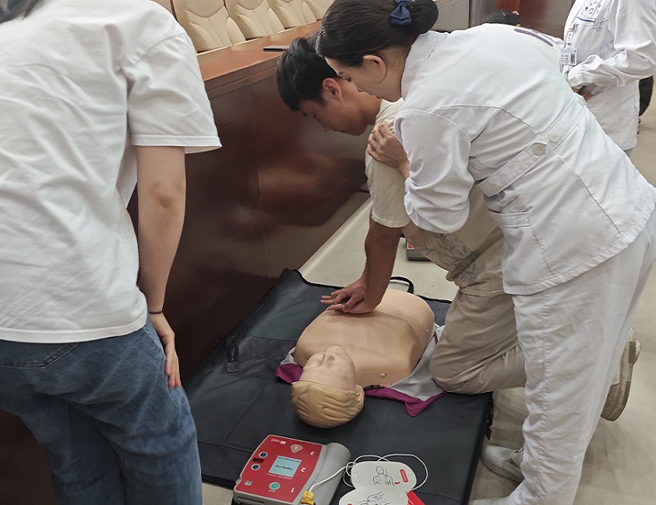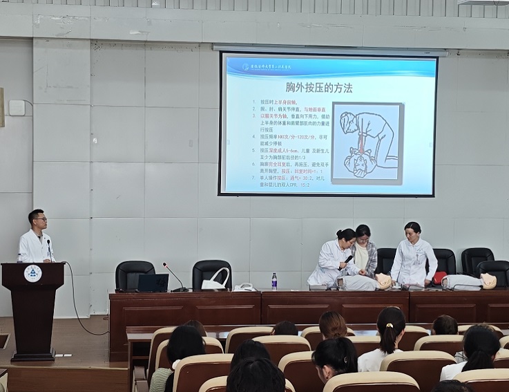 讲座中,王召华通过案例与图解,讲解常见意外伤害如烧伤、出血、中暑等急救处理方式。详尽说明心搏骤停的识别要点、心肺复苏操作流程及AED除颤仪使用规范,分步演示胸外按压手法、开放气道技巧及人工呼吸节奏,参训人员认真观摩学习。
