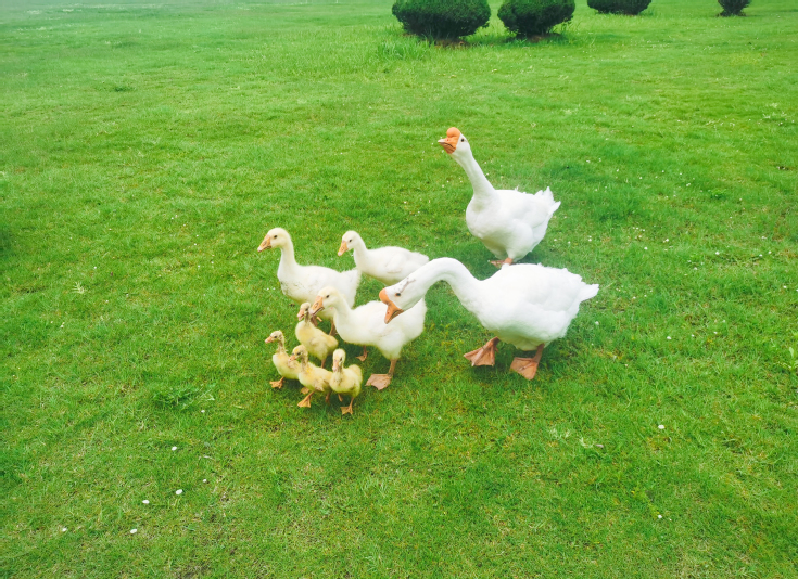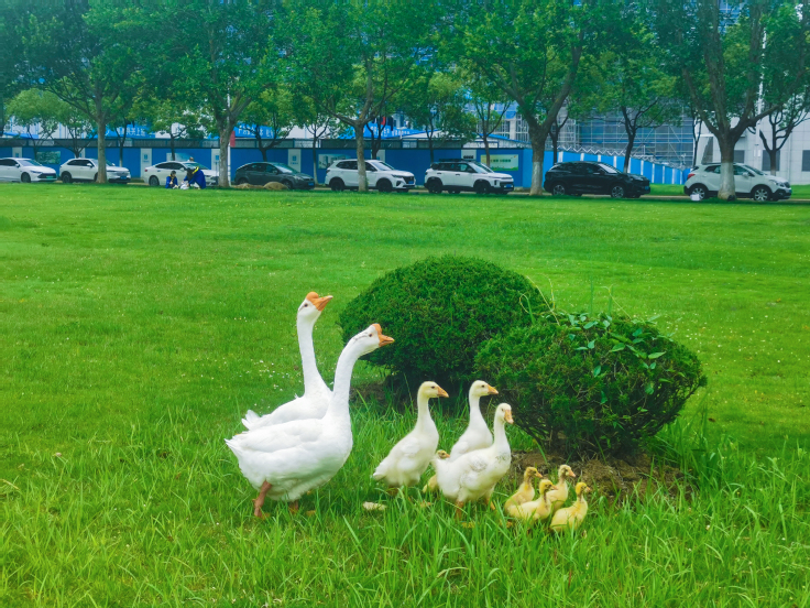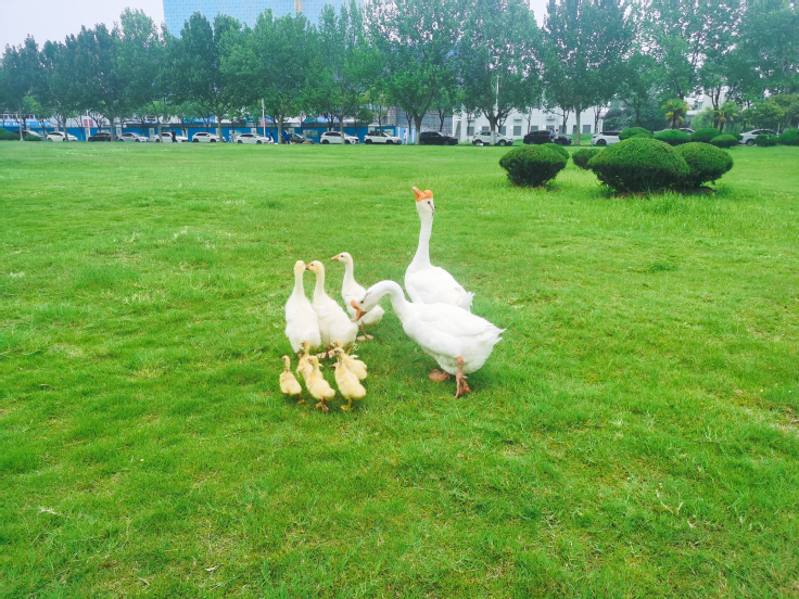 雨后初晴,惠风和畅。在“鹅爸鹅妈”的带领下,大白鹅一家来到湖边遛弯,悠然自得、其乐融融。