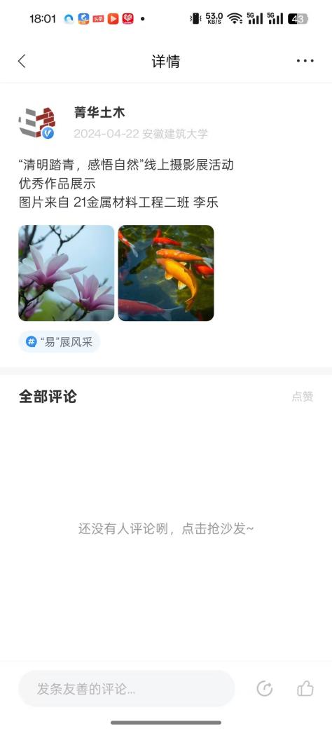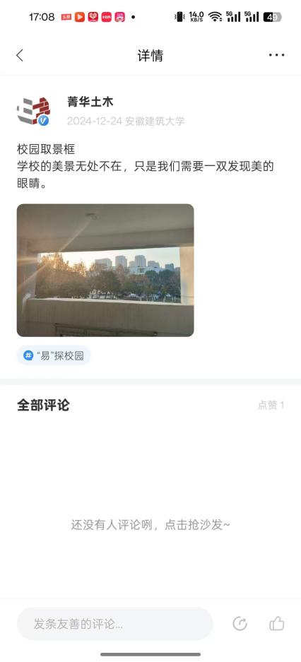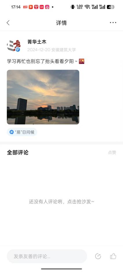 土木学院易班工作站以“易”日要闻、“易”日问候、“易”展风采、“易”起学习、“易”探校园五大主题为抓手,构建起覆盖思想引领、学业支持、文化浸润、实践服务、心理关怀的立体化育人空间。例如,通过“易”日要闻栏目实时推送校园动态、时政热点,引导学生关注社会;依托“易”起学习板块开展线上知识竞赛、主题征文,强化学生理论素养;借助“易”探校园带领同学们探索校园风景、校园趣事、校园变化等增强学生归属感。![]()