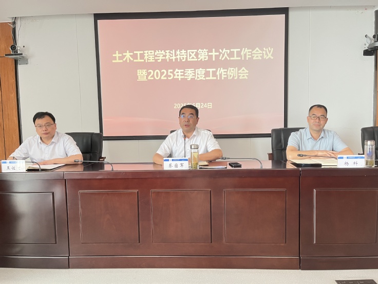 本网讯 6月24日,土木工程学科特区第十次工作例会暨2025年季度工作例会在徽风楼21楼第一会议室召开。会议由校党委副书记、校长蔡国军主持,校党委常委、副校长杨科,校党委常委、副校长王佐才,土木学院、环能学院、材化学院相关负责人以及学科特区骨干成员参加会议。会议集中探讨了学科特区建设的成果,全面梳理了过往经验,并规划了未来的发展方向,以促进土木工程学科高质量发展。