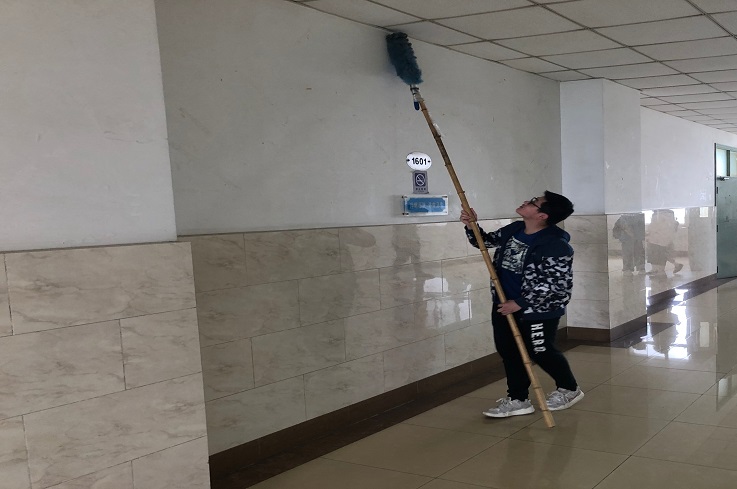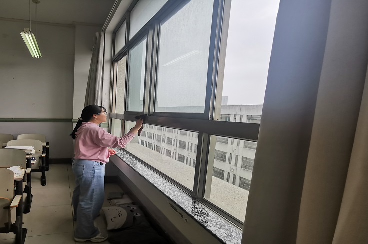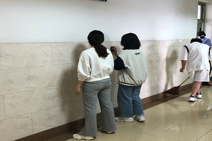 随后学生们进入主教楼6楼,活动期间,在老师和保洁阿姨的指挥下,同学们开始打扫与清洁走廊卫生,扫地,拖地,擦窗...每个人都积极地投入到劳动当中,气氛和谐融洽。骄阳下,同学们忙碌的身影来回穿梭,却只听到欢声笑语;劳动中,同学们任劳任怨自愿奉献,尽显大学生劳动风采。