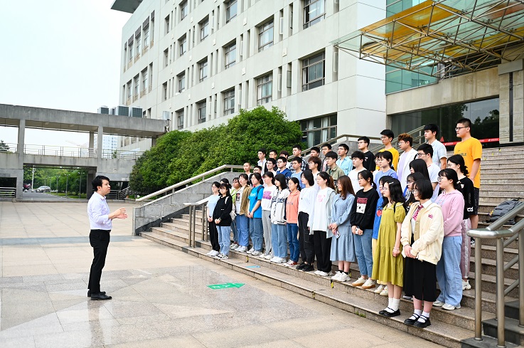 下午两点半,学生们在主教楼前集合,校团委书记唐志敏鼓励同学们争做劳动楷模,发扬劳动精神。