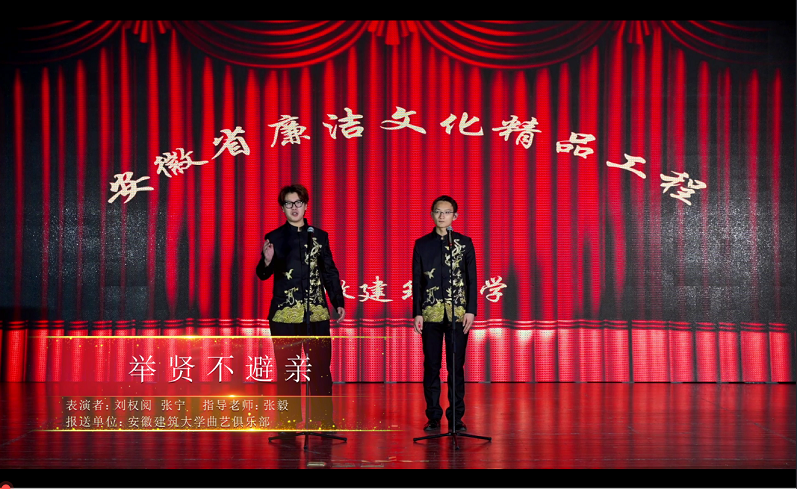 活动期间,校团委积极响应传承廉洁文化的号召,召开动员大会并设计宣传标语及海报。相声俱乐部刘权阅、张宁同学的作品《举贤不避亲》凭借其独特新颖的相声形式、生动形象的演绎获得校精品廉洁工程比赛二等奖。作品内容紧扣新时代反腐倡廉主题,弘扬廉洁文化,传播廉洁理念,以讽刺的艺术手法批判了当代社会腐败的恶势力。
