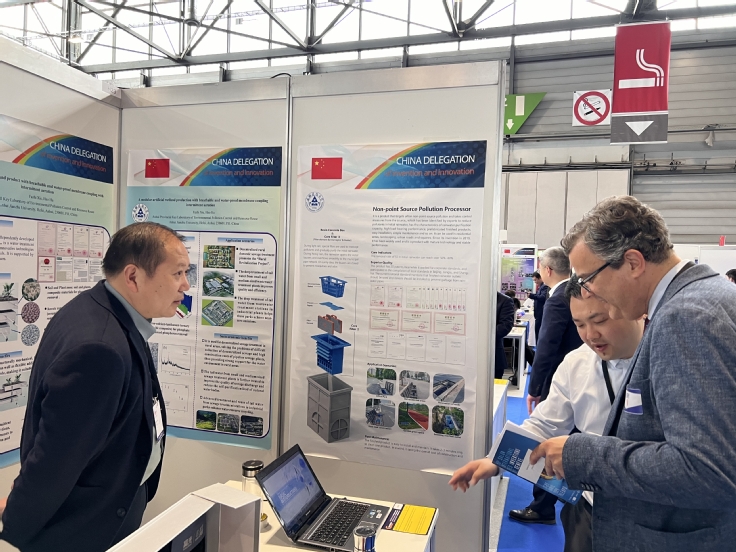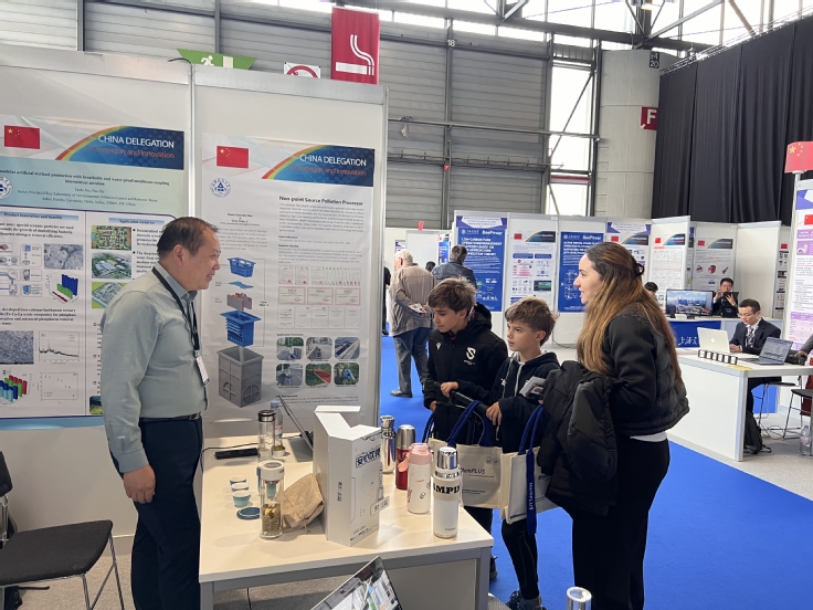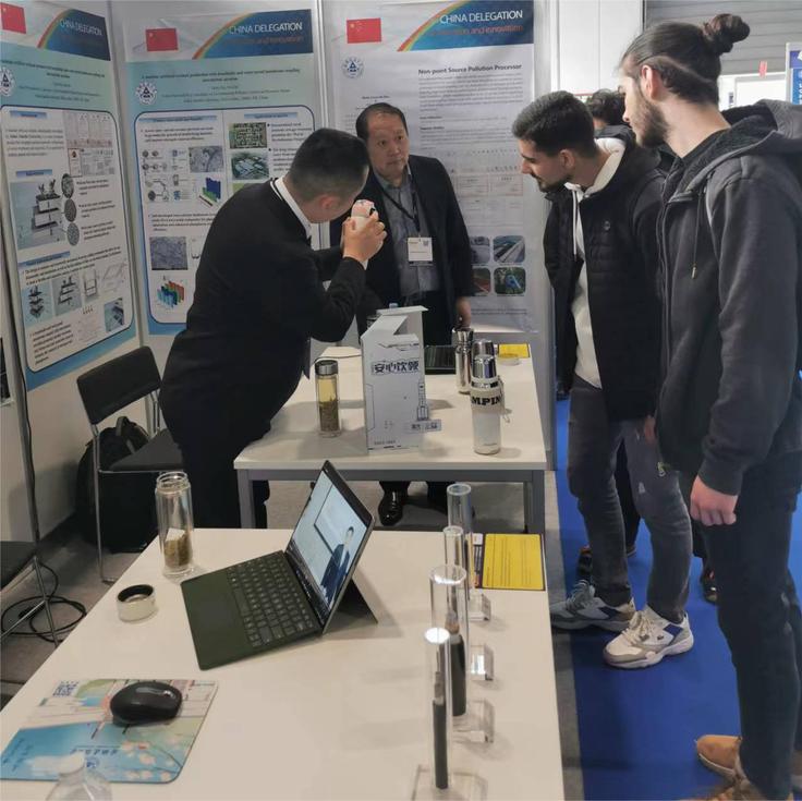 谢发之团队获奖成果“一种可滑动组合、拆卸安装,可随时添加填料或对填料进行清洗再生的模块化人工湿地”,用于中小型污水处理厂尾水深度处理,助力污水厂提质增效。谢发之在展会现场与亚美尼亚展商进行了技术交流,达成了初步合作意向。