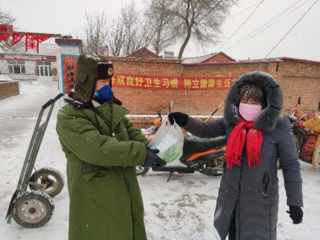 “嗒嗒嗒”这是拖拉机的声音。这时从远处漂来嘹亮的声音:“大家都在家里尽量不要出来玩啊。”突然有大娘来了一句:“这是谁家小伙子,真勤快,我们都在家呢,放心。”随后又会传来张元盛同学爽朗而质朴的笑声。虽然寒风凛冽,但是他依旧坚持着,辛苦但充实。外面飘着洁白的雪花,路过的奶奶问他冷不冷,他笑着说“不冷,即使外面是冷的,但我的心是暖的”。“外面这么冷,还在外面值守,好孩子,爷爷奶奶为你感到骄傲自豪”。他很开心的笑了,因为有种被人认可的自豪。哪怕戴着口罩看不清但是他的喜悦之情谁都能够感受到。