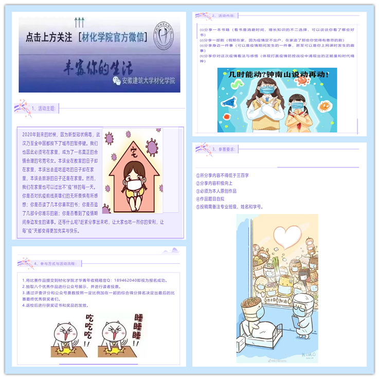 本网讯 为贯彻疫情期间“停课不停学”的精神,同时了解学生们在疫情期间的日常生活。3月18日至4月10日,材化学院举行了“分享每‘疫’天”的主题征文活动。