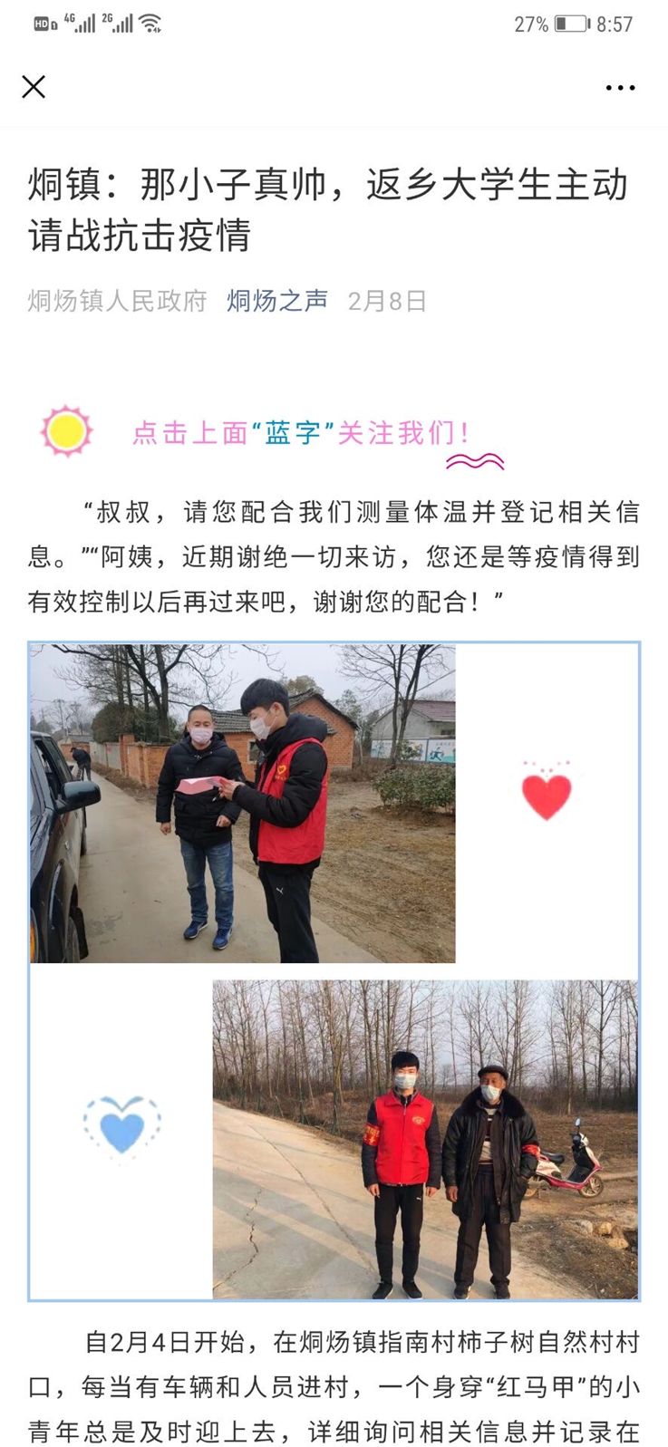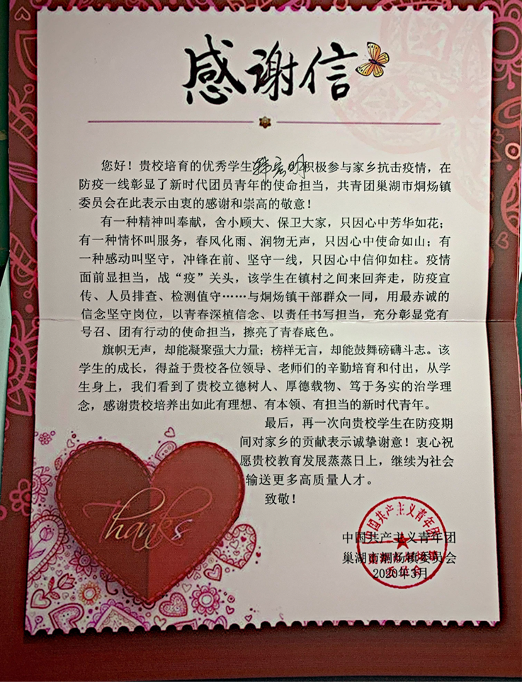 对英雄的敬仰和家乡的感情,是韩宏明请求成为志愿者的最初原因。随着越来越多的志愿者参与到这场没有硝烟的战争中,疫情很快得到控制,烔炀镇政府也为他颁发了荣誉证书,对他及培养他的母校表示感谢。烔炀镇政府也在媒体上宣传了他的事迹,向广大人民展示了当代青年大学生的作为和担当!
