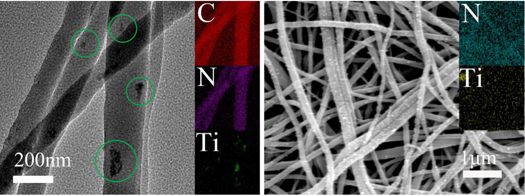 1. PAN/TiO2/PANI杂化纤维膜 (a) TEM图像 (b) SEM图像(内部:CN Ti能谱图