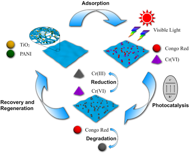 3. PAN/TiO2/PANI杂化纤维膜吸附和光催化再生示意图