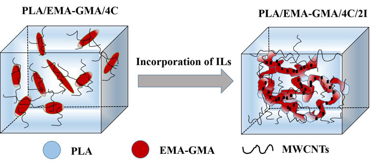 图3. ILs对PLA/EMA-GMA/MWCNTs相结构调控和界面强化增容机理