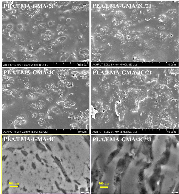图1. PLA/EMA-GMA复合材料断面SEM和TEM照片