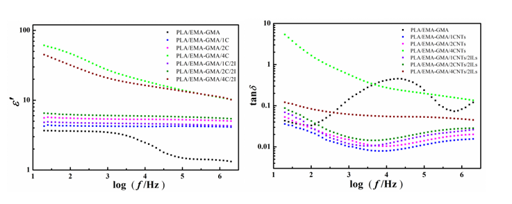 图2. PLA/EMA-GMA复合体系介电常数和介电损耗随频率的变化图