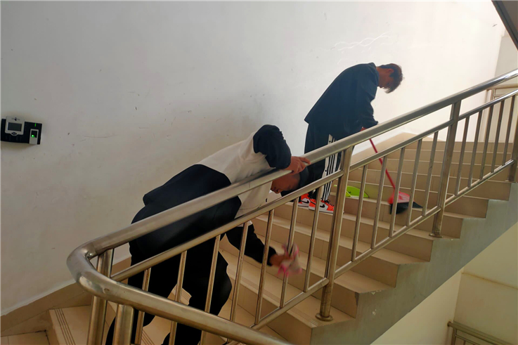 本次活动打扫的场地主要为学院办公楼的公共区域。一大早,同学们来到指定地点后,立即投入到清扫的工作中。大家分工协作、积极主动,清扫过程中,不放过任何死角,不一会儿屋子就变得更加清洁明亮。