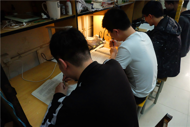 相对于一个人考研,与室友一起为共同的目标奋斗,为“灰色”的考研生活增添了色彩。三点一线的生活、枯燥的考研复习,他们六人之间相互勉励、共同进步。在相对紧张的复习环境下,大家难免会有些浮躁,但都会克制自己的小情绪,为宿舍创造一个温馨的氛围,不干扰别人。
