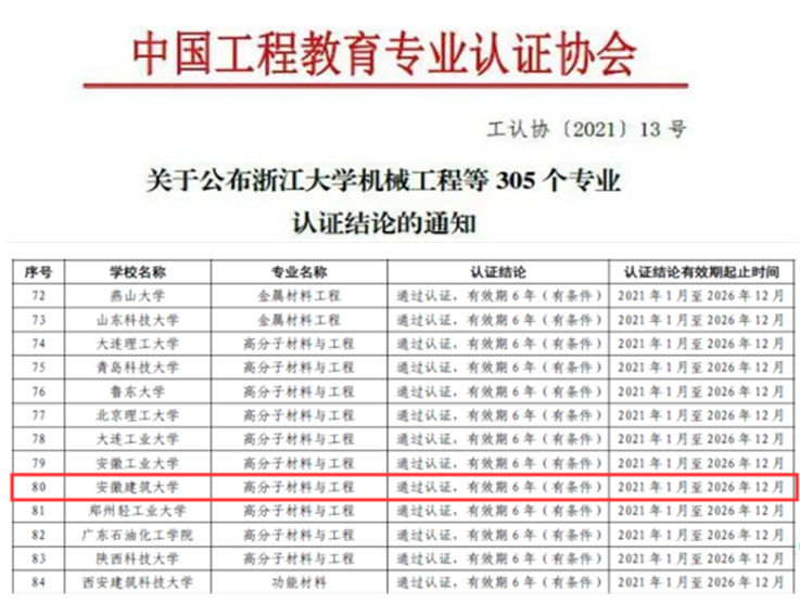 本网讯 6月10日,教育部高等教育教学评估中心、中国工程教育专业认证协会正式发布公布了2020年参加全国工程教育专业认证的部分专业认证结论(工认协[2021]13号),我校高分子材料与工程专业通过了国家工程教育专业认证,有效期6年。这标志着我校高分子材料与工程专业工程教育体系得到了国际等同认证,毕业生质量达到了行业认可的标准要求。