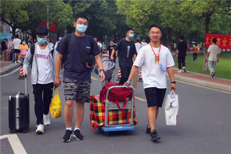 迎新当天,学院学生会成员和志愿者们早早集合,奔赴自己的岗位,严正以待,迎接新生的到来。因疫情防控要求,此次报到,新生父母及家人不允许进入学校。新生在辅导员和志愿者的帮助下,由志愿者引导他们前往报到点、扫码报到、收取材料、住宿登记……整个迎新过程井然有序,各工作人员热情洋溢,耐心解答新生们的各种问题,帮助他们搬运行李,充分发挥了材化学子的责任担当。当天下午四点左右,材化学院三百六十名新生的报到工作圆满完成。