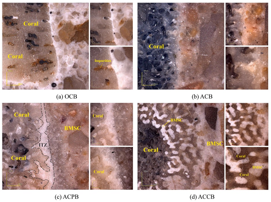 Fig. 2 Effect of coral aggregates treatment on the morphology of BMSC-based coral concrete ITZ
