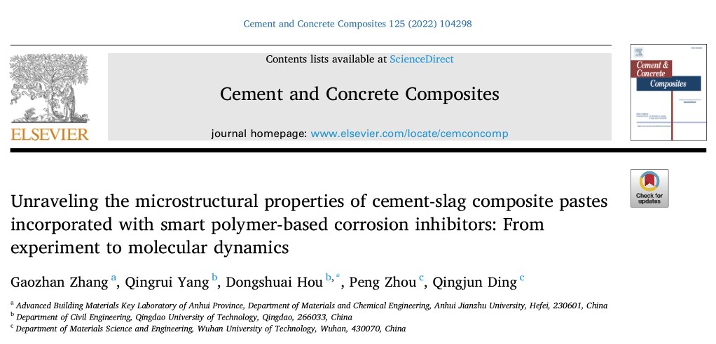 近日,我校先进土木工程材料科研团队张高展副教授联合青岛理工大学侯东帅教授和武汉理工大学丁庆军教授等在《Cement and Concrete Composites》(中科院1区,影响因子7.586)上发表题为“Unraveling the microstructural properties of cement-slag composite pastes incorporated with smart polymer-based corrosion inhibitors: From experiment to molecular dynamics”的研究论文(https://doi.org/10.1016/j.cemconcomp.2021.104298,《Cement and Concrete Composites》简称CCC,与《Cement & Concrete Research》并列为建筑材料领域两大顶级期刊。)。