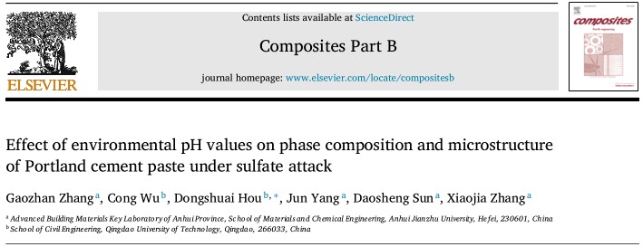 同时,这也是张高展副教授本年度继在国际复合材料顶级期刊《Composites Part B: Engineering》(中科院1区,影响因子9.078)上发表关于混凝土耐久性方面高水平学术论文“Effect of environmental pH values on phase composition and microstructure of Portland cement paste under sulfate attack”(https://doi.org/10.1016/