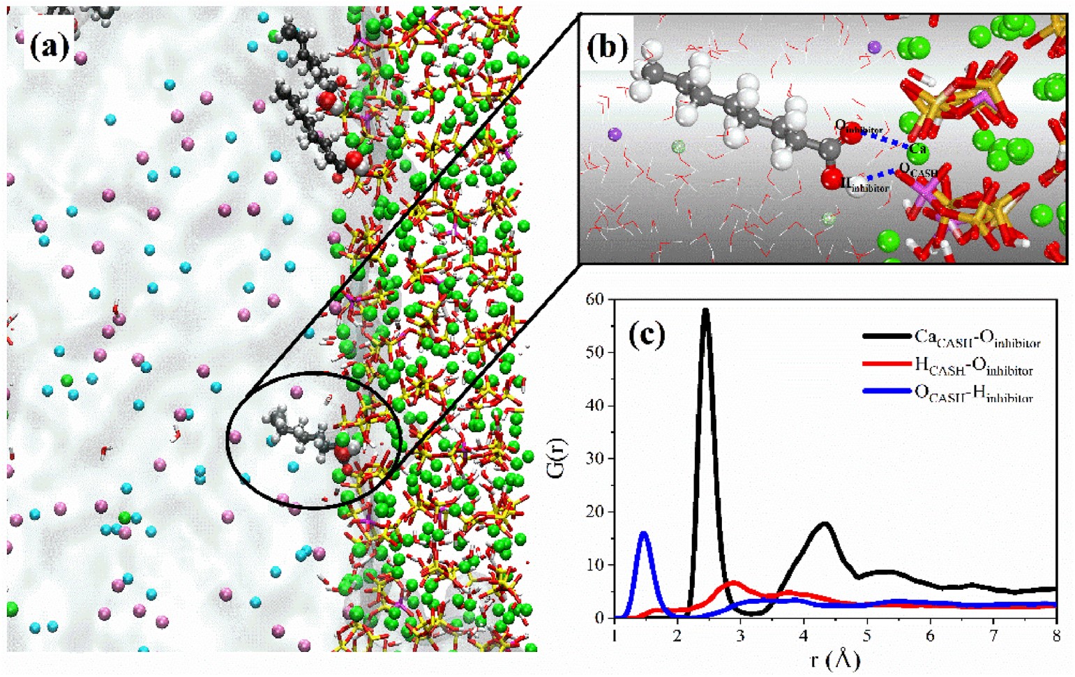 Fig. 1 Schematics of (a) the corrosion inhibitor molecules adsorbed on the CASH surface and (b) the bonding relationship between the corrosion inhibitor molecule and the CASH surface, (c) radial distribution functions of Ca CASH -O inhibitor , H CASH -O inhibitor , and O CASH -H inhibitor pairs.