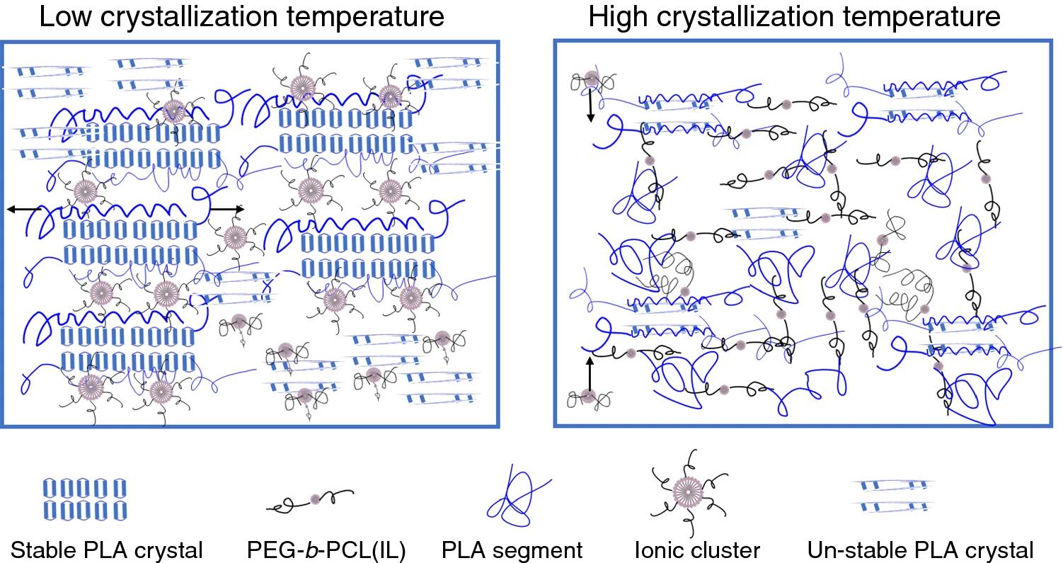 此外,针对可再生、可生物降解的聚乳酸(PLA)材料的功能化与高性能化。该团队通过将ILs链段引入含有PEG和PCL链段的嵌段共聚物TAPEC,研究两者对PLA聚集态结构的调控作用,并在此基础上研究TAPEC离子化前后对PLA结晶性能的影响,探讨离子基元在PLA结构演化过程中的作用机理。相关成果在Journal of Thermal Analysis and Calorimetry上发表(IF:4.626)。