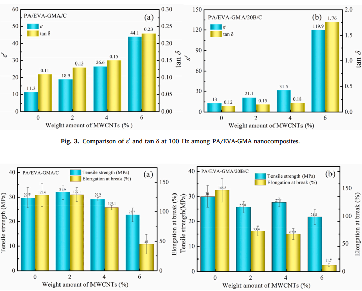 王平博士及其研究团队通过熔融共混法将羟基化钛酸钡(BT-OH)和多壁碳纳米管(MWCNT)引入聚酰胺(PA)和乙烯-醋酸乙烯酯-甲基丙烯酸缩水甘油酯无规三元共聚物(EVA-GMA)共混物中。利用BT-OH的高介电常数以及聚合物与两种纳米填料之间显著的界面极化效应。制备了具有高介电常数、低介电损耗以及优异刚韧平衡性的PA/EVA-GMA/20B/4C复合材料。相关成果在Composites Communications上发表(材料类TOP期刊;IF:6.617)。