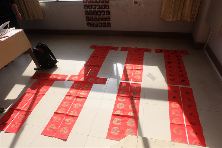 “须将恬淡修心性,应付风霜磨傲骨”、“鸿图大展前途远,吉星高照事业新”、“春至百花香满地,时来万事喜临门”。书画协会的成员们现场泼墨撰写的春联既有挥别牛年、喜迎虎年辞旧迎新的美好愿望,也有平安吉祥、傲骨寒窗的励志高歌。隶书的有折无转、楷书的齐而不拘、行书的悠游流转,在汉字的线条美与结构美之中传递了浓郁的新春祝福。