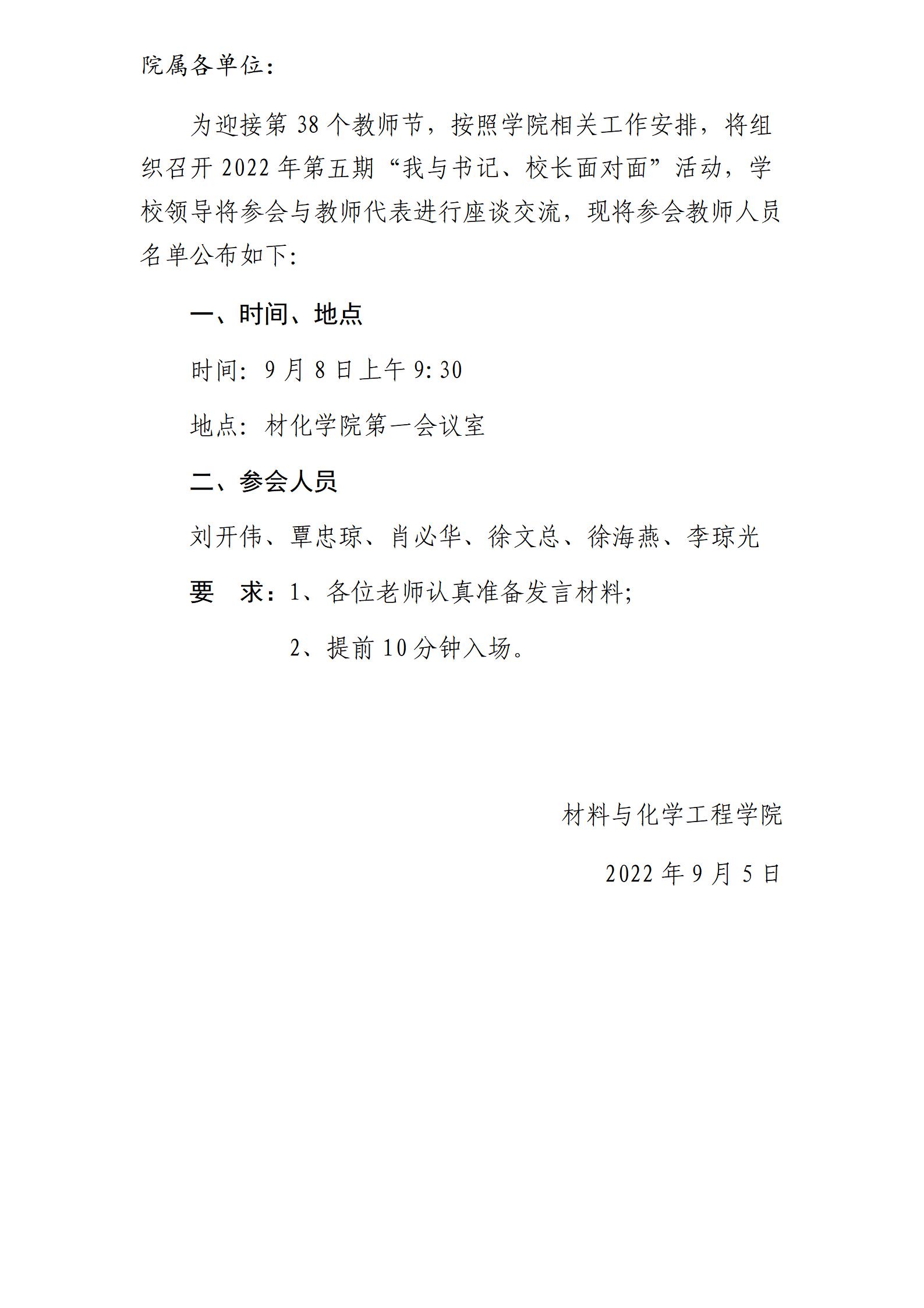 材化学院关于第五期“我与书记、校长面对面”活动参会人员名单的通知