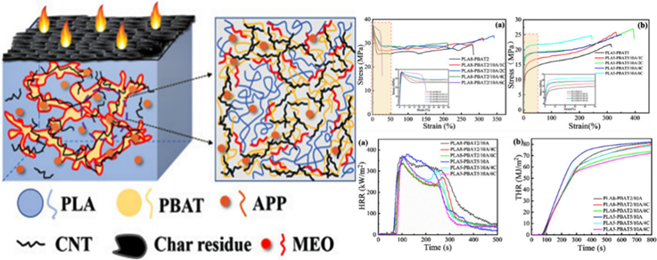 在功能化高性能可生物降解材料领域,王平副教授及其研究团队通过引入一种自主设计的多功能环氧低聚物(MEO)对聚乳酸(PLA)/聚对苯二甲酸己二酸丁二醇酯(PBAT)共混物相界面进行调控,同时改善碳纳米管(CNTs)分散状态,实现了在较高的填料含量下材料韧性和阻燃性能共同提升。相关成果在国际期刊International Journal of Biological Macromolecules(中科院一区,化学类TOP期刊,IF=8.025)上发表。