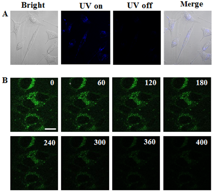 图3、蓝色荧光C-dots(A)与PVP-包裹的Py-C-dots(B)着色的HeLa细胞抗氧与时间分辨成像。(文/图:肖必华、邹文生;审稿:丁益)
