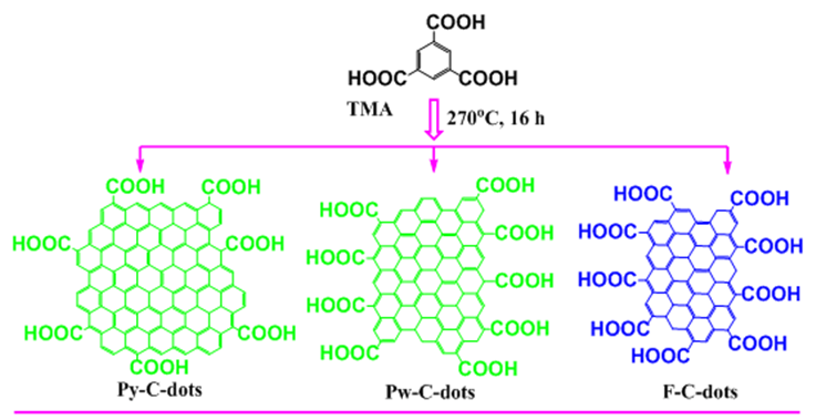 图1. 以均苯三甲酸为碳源,一锅法制备三C-dots的示意图。