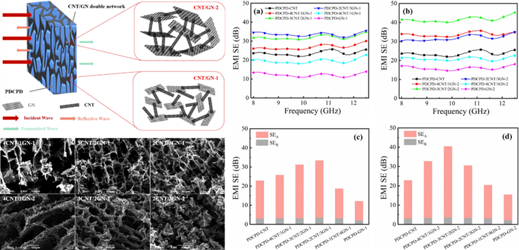 另外,在高功能性热固性材料领域,该团队还通过前端开环易位聚合(FROMP)制备了高EMI屏蔽效能(SE)的聚双环戊二烯-碳纳米管/石墨烯纳米片气凝胶(PDCPD-CNT/GN)。通过设计的3D框架解决了CNT和GN的聚集问题,并将其作为电子传输的快速通道,衰减传入的电磁波。相关成果在国际材料领域著名期刊Advanced Composites and Hybrid Materials(中科院一区,材料类TOP期刊,IF:11.806)上发表。并以此为基础制备了高阻燃PDCPD热固性复合材料和高性能机车用线缆材料,相关成果发表在《高分子材料科学与工程》发表,并授权发明专利2件(ZL202110260171.8、ZL202010522684.7)。