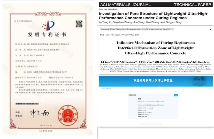 李洋同学硕士期间先后在Construction and Building Materials、ACI Materials Journal、Journal of Wuhan University of Technology等刊物上发表了6篇高水平学术论文,并获得1项国家发明专利授权。目前该生已被东南大学材料科学与工程学院录取为博士研究生。