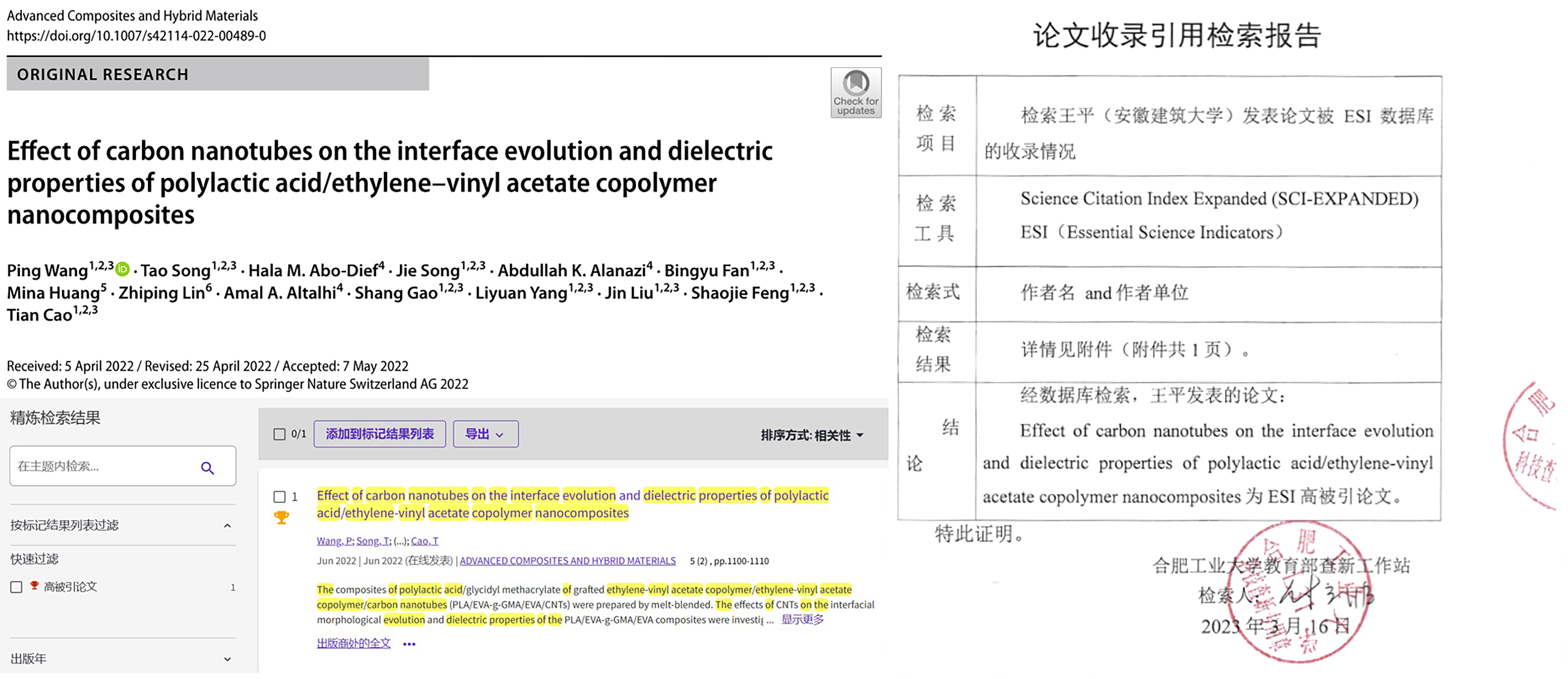 本网讯 根据美国基本科学指标(Essential Science Indicator,ESI)2023年3月公布的数据显示,我校材料与化学工程学院王平副教授在国际著名材料学科学术期刊Advanced Composites and Hybrid Materials(IF=11.806,JCR、中科院双一区TOP期刊)发表的论文《Effect of carbon nanotubes on the interface evolution and dielectric properties of polylactic acid/ethylene–vinyl acetate copolymer nanocomposites》被ESI数据库遴选为高被引论文。