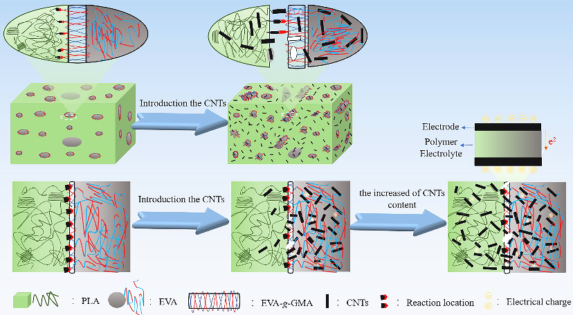 王平副教授为该论文第一及通讯作者,硕士研究生宋涛为第二作者,ku游官方材料与化学工程学院为论文第一单位。该论文通过引入甲基丙烯酸缩水甘油酯接枝乙烯-醋酸乙烯酯共聚物(EVA-g-GMA)提高了PLA/EVA的界面相容性,实现了通过界面作用诱导多壁碳纳米管(CNTs)在界面处的可控分散,制备出具有电学性能和良好刚韧平衡性的PLA/EVA-g-GMA/EVA/CNTs复合材料。为创建高性能多组分PLA复合材料和扩大PLA基生物可降解材料在微米级存储电容器等电子领域的应用提供一种创新的方法。该论文自2022年5月份发表后,得到国内外学者广泛关注,9个月以来谷歌学术引用43次,他引42次。