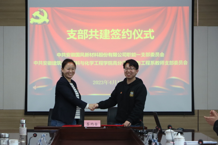 随后,材化学院高分子材料与工程系教师党支部书记王帝和纪检委员王献彪与安徽国风新材料股份有限公司职能第一党支部书记赵芬娜交流了支部党建工作和科研工作,表达了对本次支部共建“合作共赢、深度交融”的良好期盼,希望借助多种多样的形式和内容,充分发挥支部共建“资源共享、优势互补”功能,进一步增强党支部的创造力、凝聚力和战斗力,推进党建工作和业务工作双向融合、同步提升。
