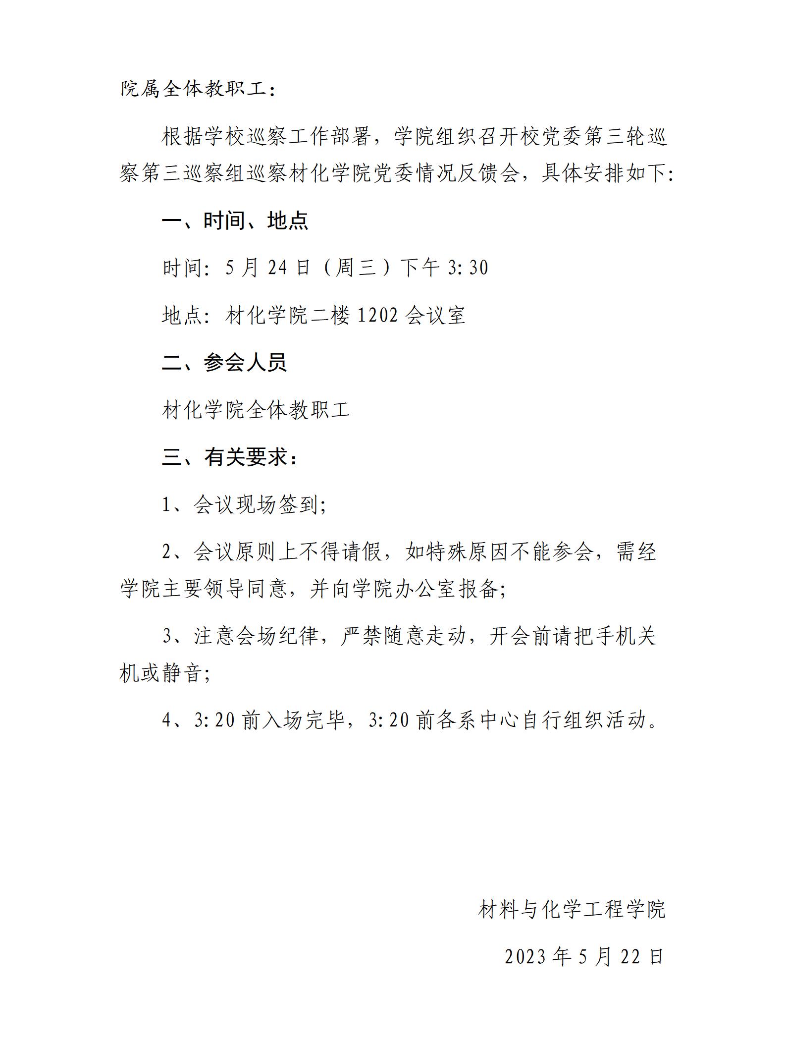 关于召开校党委第三轮巡察第三巡察组巡察材化学院党委情况反馈会的通知
