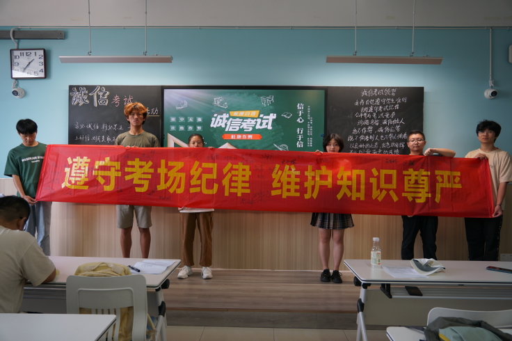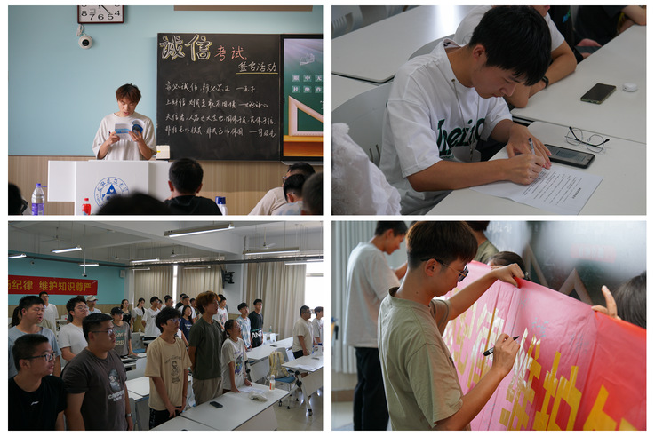 活动中,材化学院各班级共同学习了《ku游官方学生手册》和《ku游官方考试管理规定》等相关文件,通过解读“国考作弊入刑”、“校考作弊处分”相关条款、发出“诚信考试光荣,违纪作弊可耻”的倡议,引导同学们加强对诚信考试重要性的认识、树立诚实守信的行为习惯,鼓励同学们在各项考试中努力复习、认真备考,尽全力考出自己的真实水平。各班级以“签订一份诚信考试承诺书”、“组织一次诚信考试宣誓会”、“在诚信考试横幅签名”等形式为载体,进行广泛宣传,提高学生自觉维护考风考纪,养成遵守考试纪律的意识。