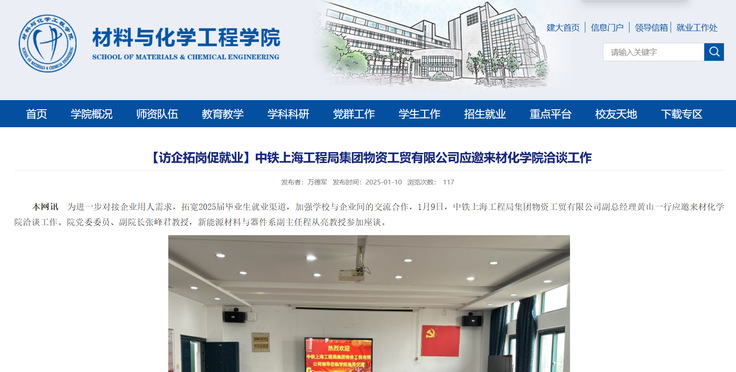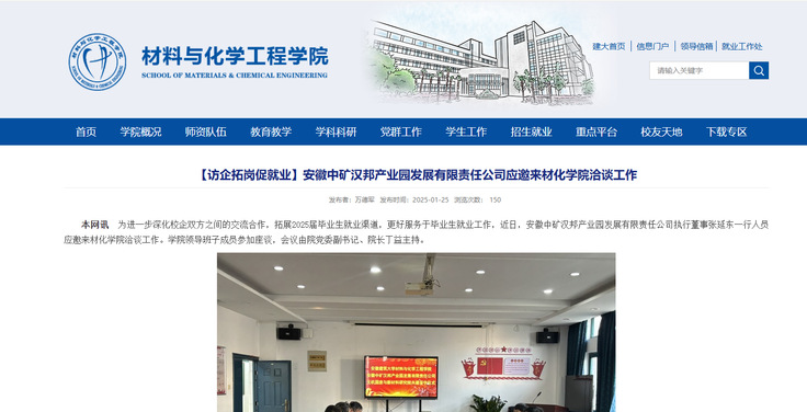本网讯 根据校就函〔2025〕1号文件精神要求,材化学院党委利用寒假时间积极开展“寒假促就业暖心行动”,于1月份分别邀请中铁上海工程局集团物资工贸有限公司和安徽中矿汉邦产业园发展有限责任公司来我院开展访企拓岗促就业专项行动,并举行了共建签约仪式。