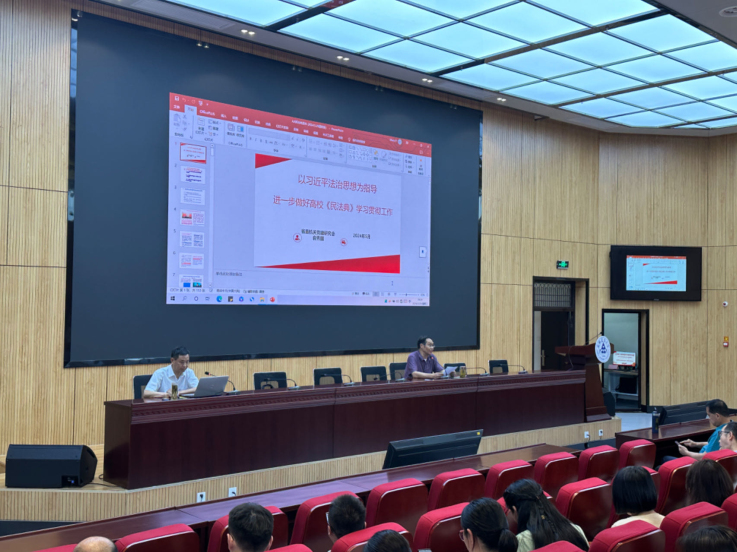 本网讯 2024年5月是全国第四个“民法典宣传月”,为贯彻落实习近平总书记关于 “让民法典走近群众身边,走进群众心里” 的重要批示精神,按照学校党委印发的《进一步开展全校领导干部应知应会党内法规与国家法律法规学习的通知》文件精神,5月29日下午,产业党总支联合机关第一党委、第二党委在徽韵楼二楼报告厅开展《民法典》学习辅导报告会。邀请省直机关党建研究会会长、一级巡视员俞秀国同志作题为“以习近平法治思想为指导 进一步做好高校《民法典》学习贯彻工作”辅导报告,三个单位的科级以上干部150余人参会,报告会由机关第一党委书记徐军主持。